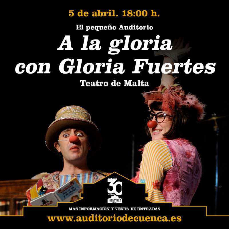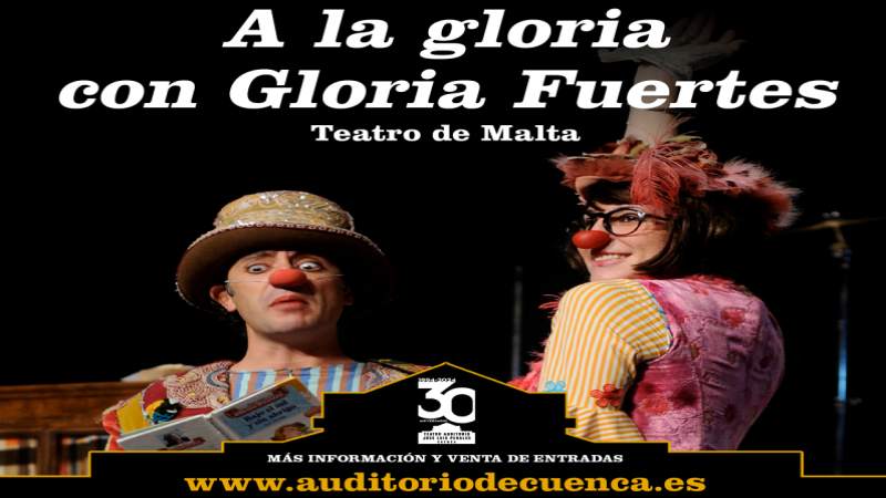 El 5 de abril, Teatro de Malta presenta en el Teatro Auditorio de Cuenca »A la gloria con Gloria Fuertes». Un espectáculo de clown lleno de poesía, humor y emoción. Teatro de Malta cierra su homenaje a Gloria Fuertes en esta obra para clown que contiene sobre todo poemas dedicados a los animales, al circo, al pacifismo y a la propia autora.