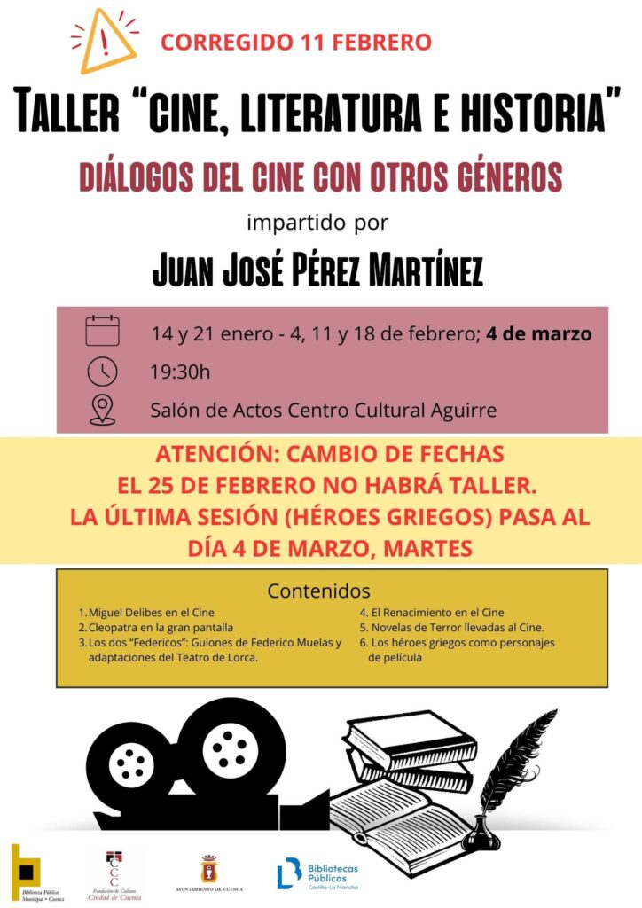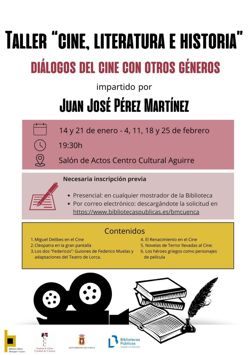 La Biblioteca Municipal del Centro Cultural Aguirre de Cuenca acogerá, entre el 14 de enero y el 25 de febrero de 2025, el taller gratuito «Cine, Literatura e Historia: Diálogos del cine con otros géneros». La actividad, dirigida por el docente y cineasta Juan José Pérez Martínez, tendrá lugar en el salón de actos del centro, en horario de 19:30 a 20:45 horas.