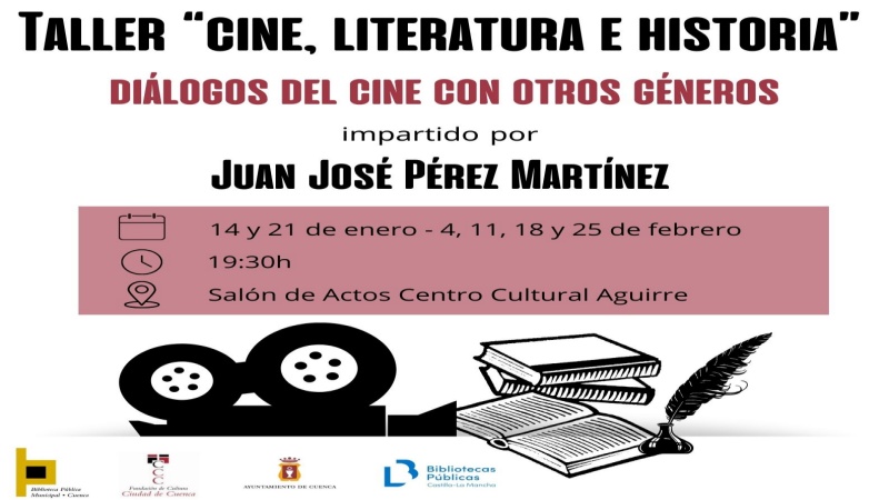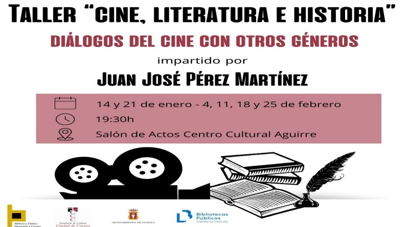 La Biblioteca Municipal del Centro Cultural Aguirre de Cuenca acogerá, entre el 14 de enero y el 25 de febrero de 2025, el taller gratuito «Cine, Literatura e Historia: Diálogos del cine con otros géneros». La actividad, dirigida por el docente y cineasta Juan José Pérez Martínez, tendrá lugar en el salón de actos del centro, en horario de 19:30 a 20:45 horas.