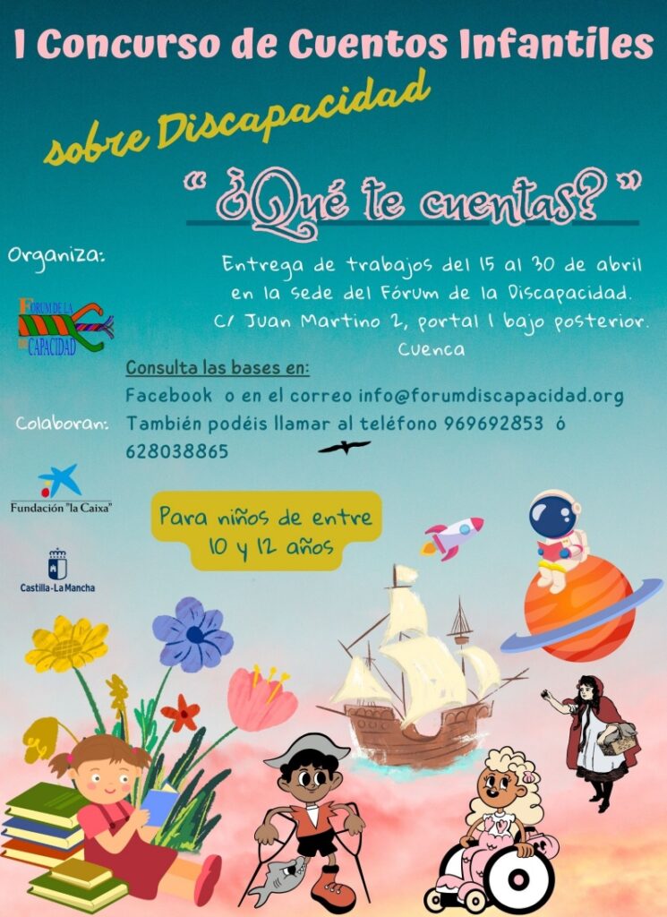 El Fórum de la Discapacidad de Cuenca convoca el I Concurso de Cuentos Infantiles sobre Discapacidad “¿QUÉ TE CUENTAS?” en el que los participantes, niñas y niños de entre 10 y 12 años, deberán presentar un cuento breve cuyo tema principal sea la discapacidad. El plazo para entregar los trabajos termina el 30 de abril.