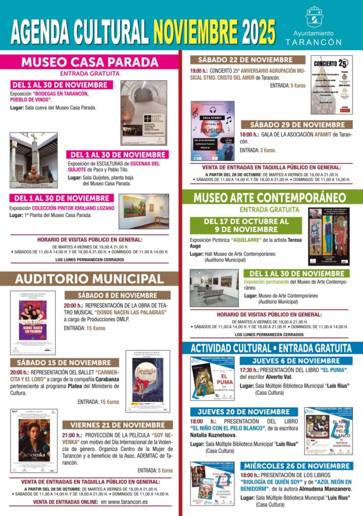El Ayuntamiento de Tarancón ha presentado su Agenda Cultural de noviembre 2025, un mes repleto de actividades que combinan arte, teatro, danza, música y literatura, y que se desarrollarán en los principales espacios culturales de la ciudad: Museo Casa Parada, Auditorio Municipal, Museo de Arte Contemporáneo y Casa de Cultura “Luis Rius”.