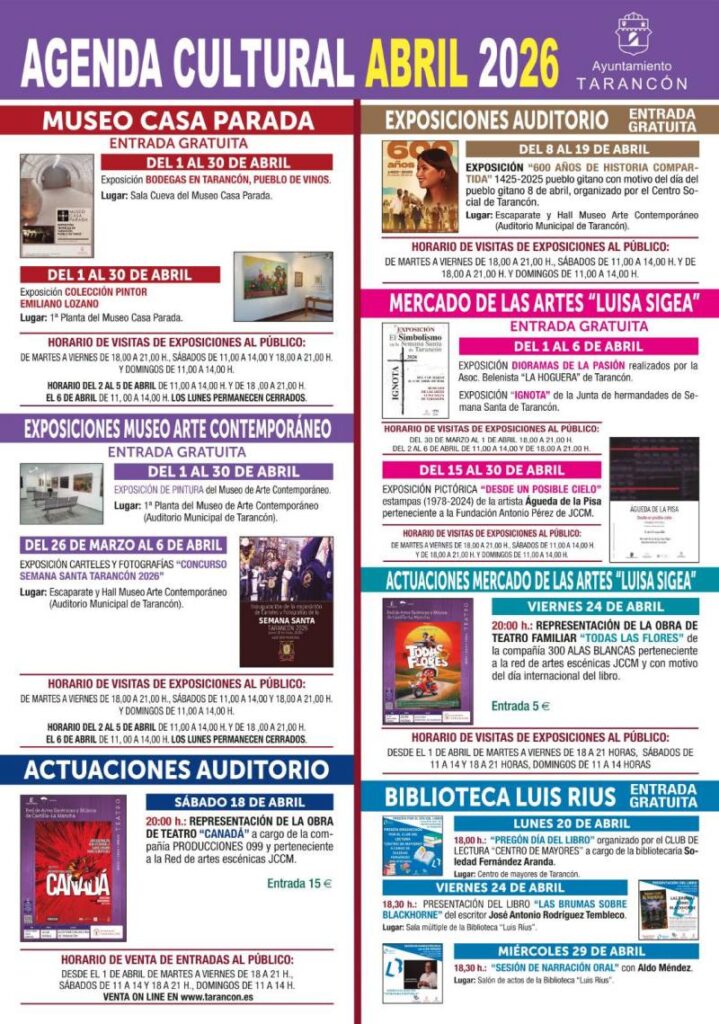 El Ayuntamiento de Tarancón ha dado a conocer su Agenda Cultural de abril de 2026, una completa programación que reúne exposiciones, teatro, actividades literarias y propuestas culturales gratuitas, consolidando su compromiso con el acceso a la cultura para todos los públicos.