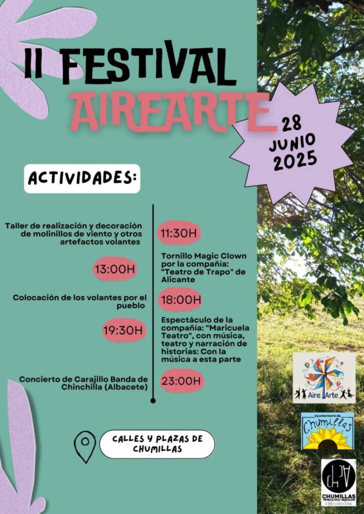 Las calles de Chumillas acogen este sábado 28 de junio la segunda edición del Festival AireArte, una jornada festiva organizada dentro del programa ChAC (Chumillas Acción Cultural) que llenará plazas y rincones del pueblo de arte, creatividad y música.