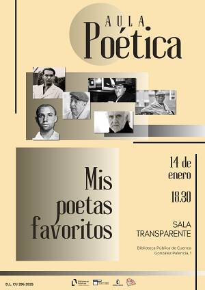 La Sala Transparente de la Biblioteca Pública del Estado en Cuenca ‘Fermín Caballero’ acoge el próximo miércoles 14 de enero de 2026 a las 18:30 horas una nueva sesión del Aula Poética, titulada “Mis poetas favoritos”. Un recital de poesía contemporánea en el que los integrantes del Aula leerán y compartirán poemas de autores actuales.