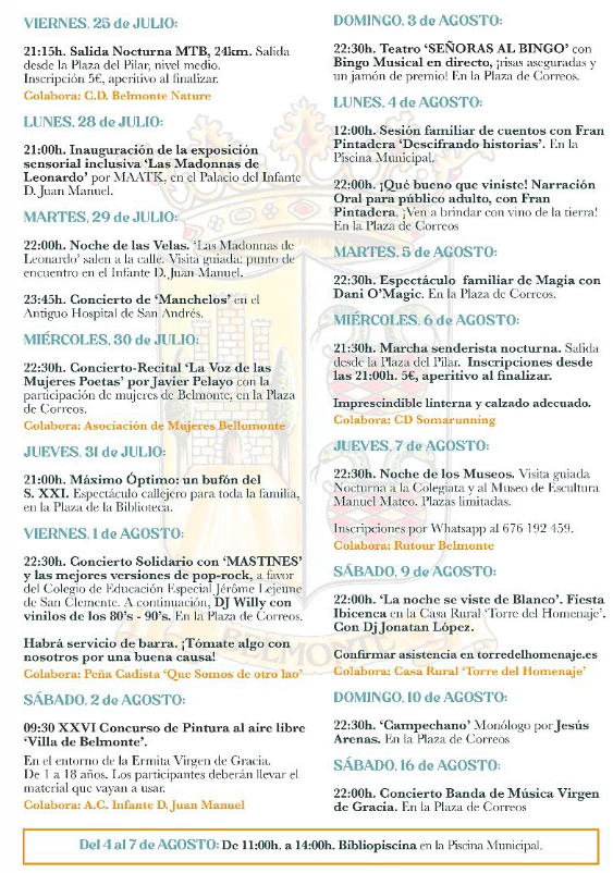 El programa arrancará el 25 de julio con la celebración de la XIII Noche BTT Nocturna MTB «Belmonte», una ruta ciclista de 24 kilómetros bajo el cielo estrellado. El 28 de julio se inaugurará la exposición sensorial e inclusiva «Las Madonnas de Leonardo» en el Palacio del Infante Don Juan Manuel, que tomará las calles en la Noche de las Velas del día 29, coincidiendo con el concierto del grupo «Manchelos».