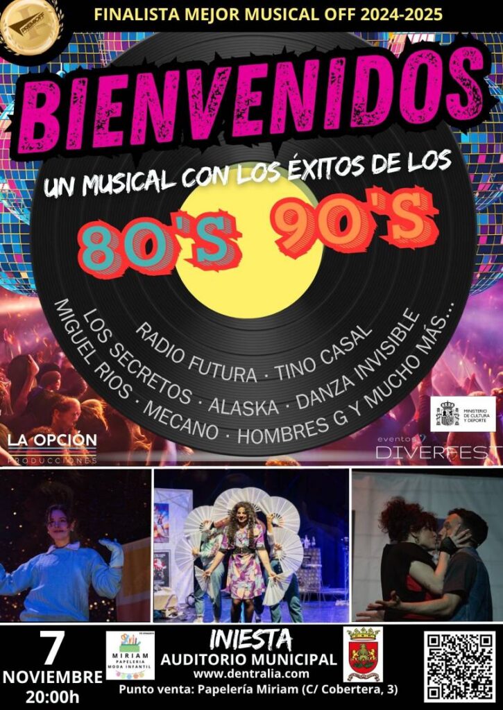 Prepárate para un viaje inolvidable a las décadas que marcaron a toda una generación. El próximo 7 de noviembre a las 20:00 horas, el Auditorio Municipal de Iniesta acoge la esperada representación de “BIENVENIDOS”, un espectacular musical que rinde homenaje a los grandes éxitos de los años 80 y 90, combinando las voces en directo, la interacción con el público y un hilo teatral digno de los espectáculos de gran formato.