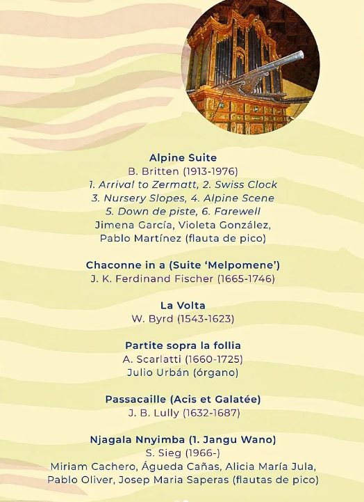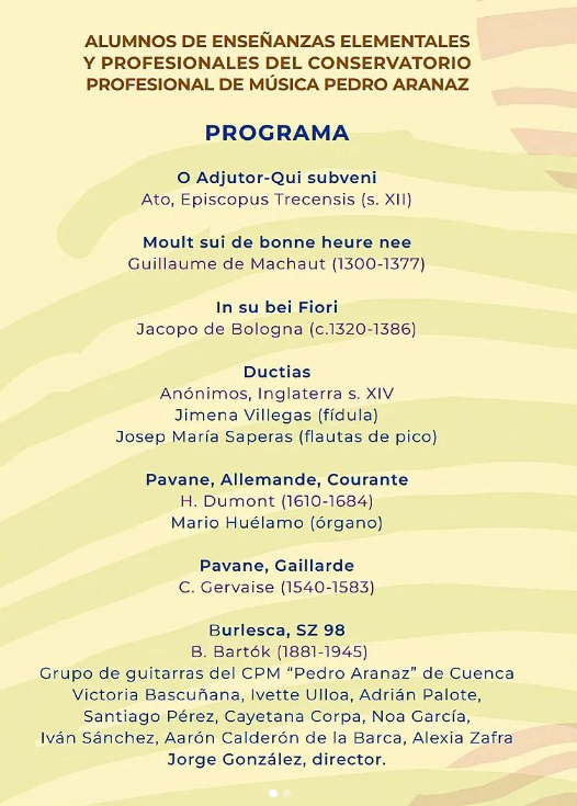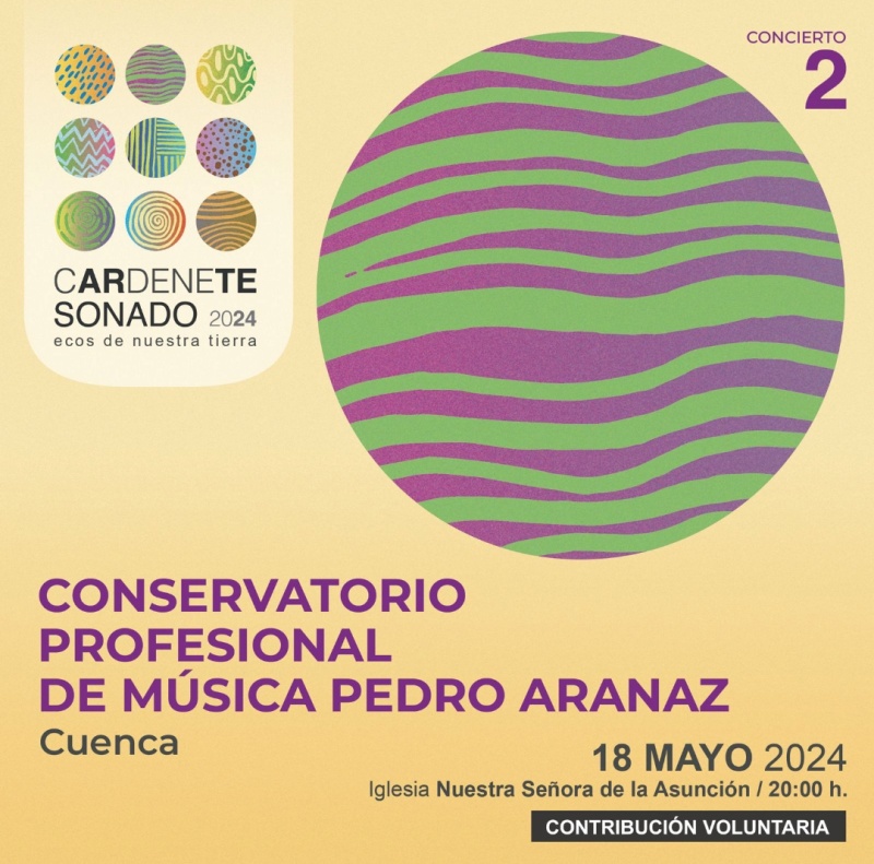 Para el próximo sábado 18 de mayo a las 20:00 horas, cARdeneTE SONADO 2024 nos trae un nuevo concierto en la iglesia de Nuestra Señora de la Asunción. En esta ocasión, serán los alumnos del Conservatorio Profesional de Música Pedro Aranaz de Cuenca quienes se presenten, mostrando su talento en diversas agrupaciones instrumentales, guitarras, flautas, flauta de pico… incluyendo el órgano histórico que adorna el templo parroquial.