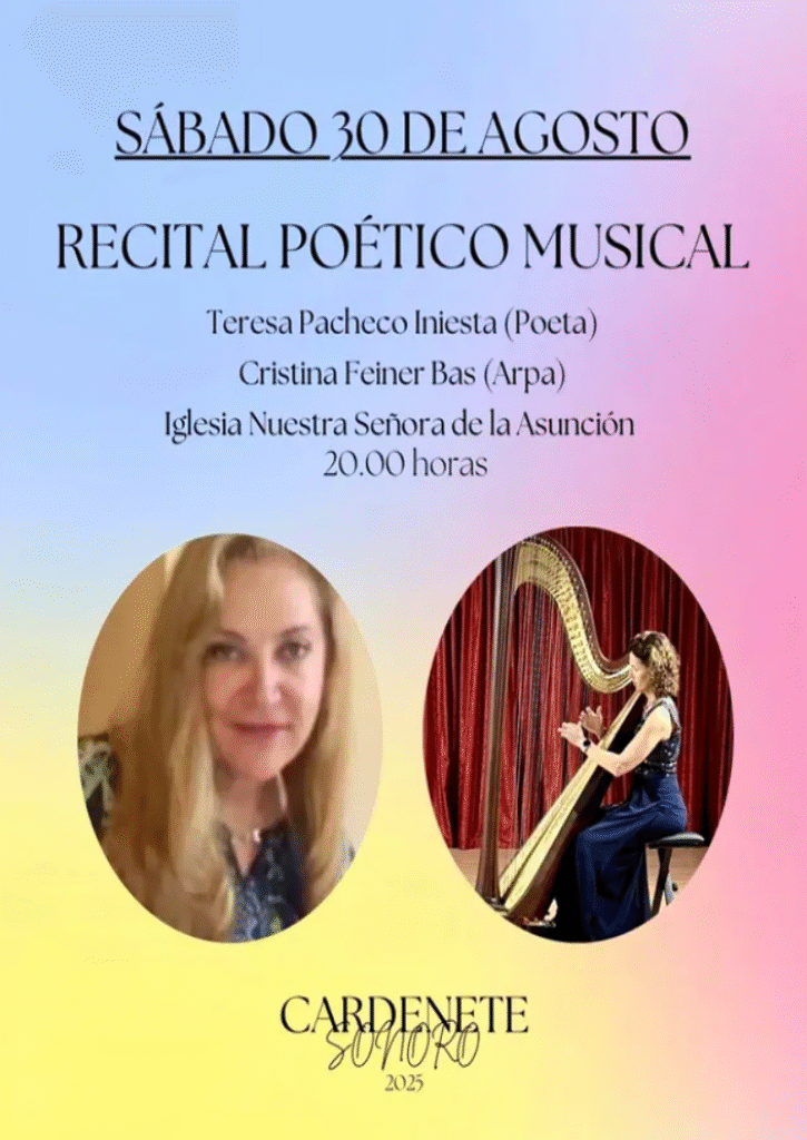 Cardenete Sonoro 2025 ofrece el 30 de agosto un recital de poesía y arpa con Teresa Pacheco y Cristina Feiner en la iglesia parroquial.