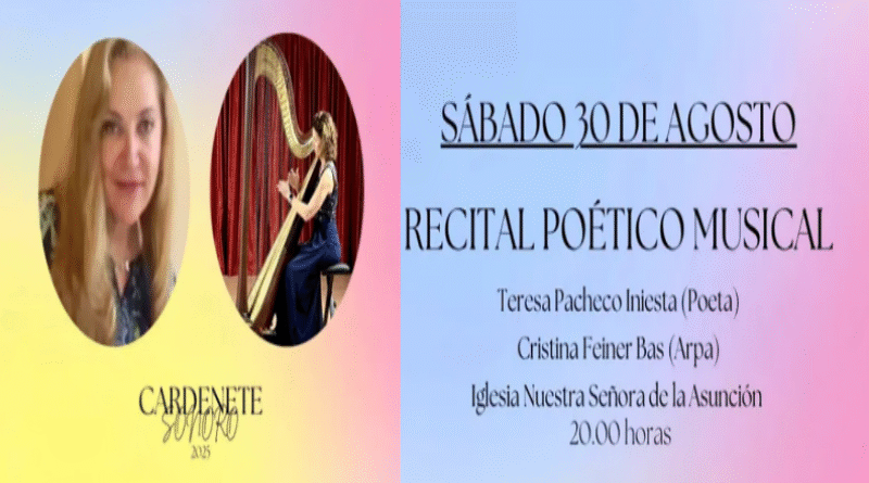 Cardenete Sonoro 2025 ofrece el 30 de agosto un recital de poesía y arpa con Teresa Pacheco y Cristina Feiner en la iglesia parroquial.