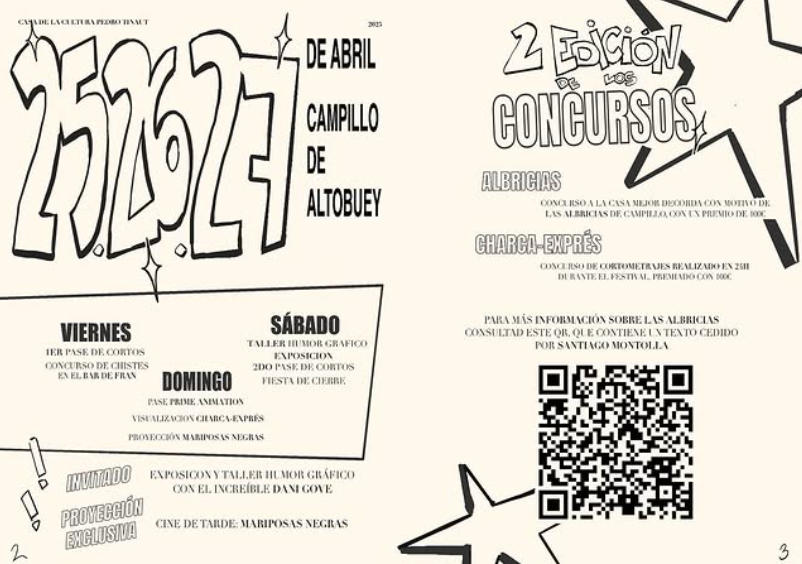 El Charcajada Film Fest celebra su cuarta edición del 25 al 27 de abril de 2025 en la Casa de la Cultura ‘Pedro Tinaut’ de Campillo de Altobuey. Un fin de semana cargado de cine cómico, talleres, concursos y propuestas culturales para todos los públicos.