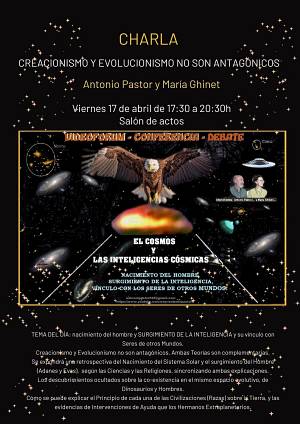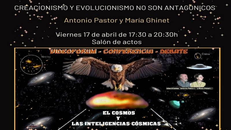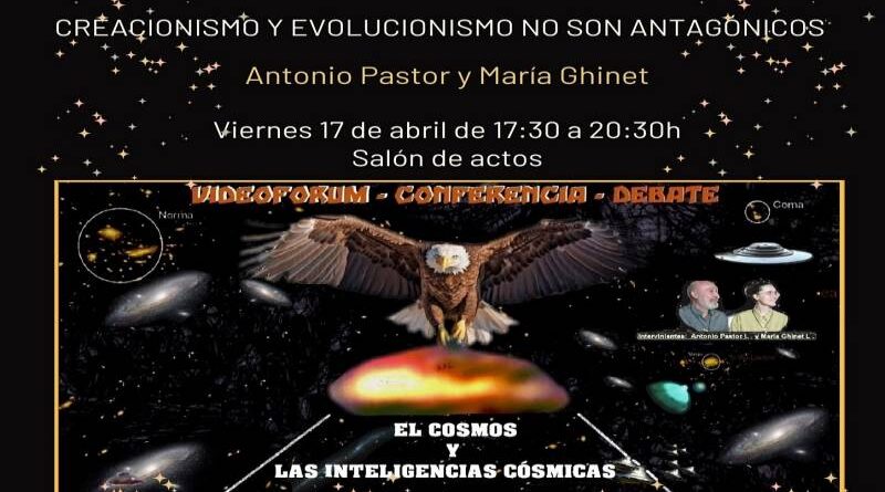 El próximo viernes 17 de abril, el Salón de actos del Centro Cultural Aguirre de Cuenca será escenario de la segunda y última charla del ciclo relacionado con misterio, ovnis, vida en otros planetas… a cargo de Antonio Pastor y María Ghinetuna. Bajo el título de «Creacionismo y Evolucionismo no son antagónicos. Ambas Teorías son complementarias» la charla dedicada al nacimiento del hombre y su posible vínculo con seres de otros mundos ofrecerá una exposición que combina ciencia, religión y pensamiento filosófico.
