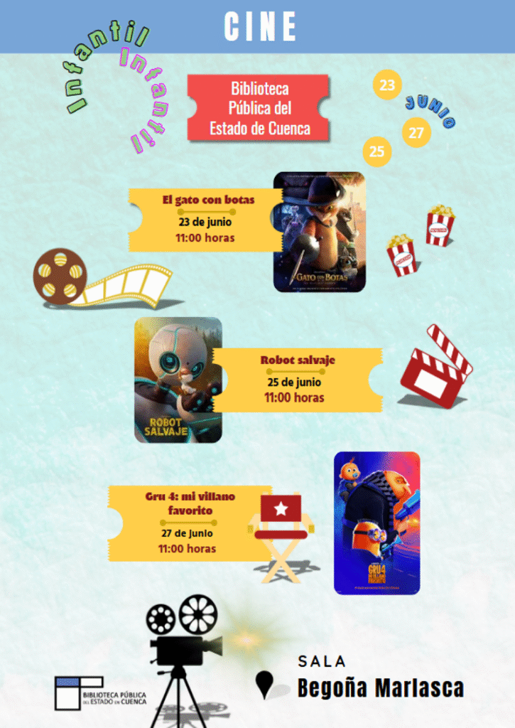 Películas infantiles gratis en la Biblioteca Pública de Cuenca los días 23, 25 y 27 de junio. Sesiones matinales en la Sala Begoña Marlasca.
