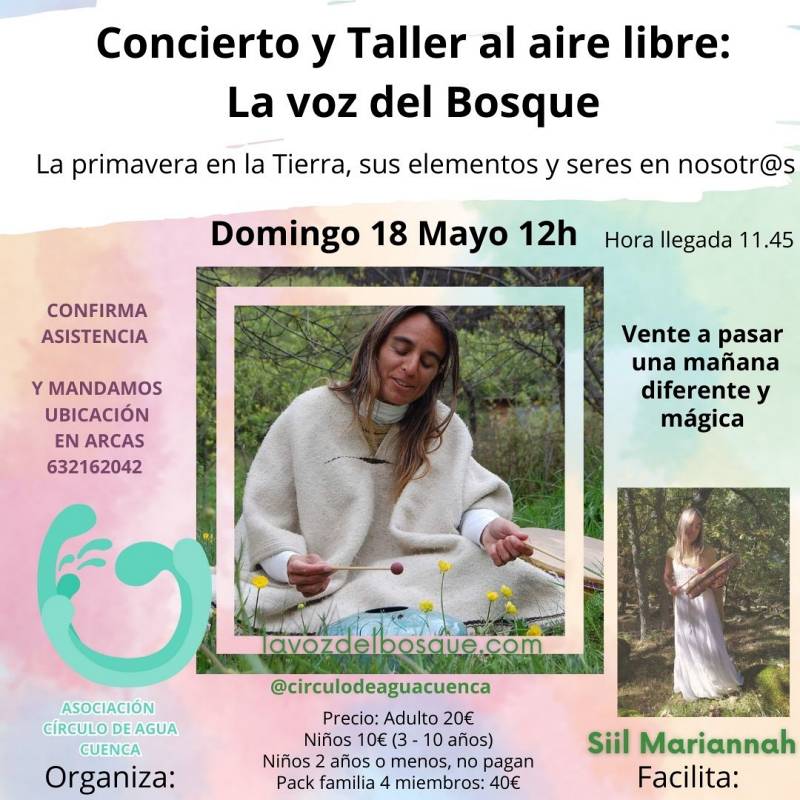 Domingo 18 de mayo · Recepción: 11:45 h · Inicio: 12:00 h · En un espacio natural cerca de Cuenca, vive una experiencia sonora y vivencial en plena conexión con la Tierra.