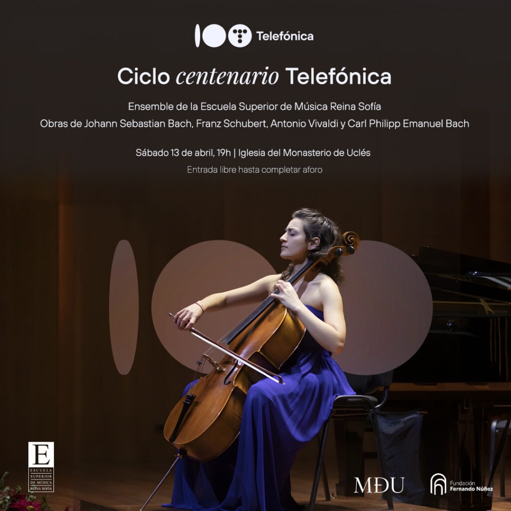 Con motivo de la conmemoración del 100 aniversario de Telefónica, el próximo sábado 13 de Abril, tendrá lugar en la Iglesia del Monasterio de Uclés el concierto del Ensemble de la Escuela Superior de Música Reina Sofía dirigido por Francisco Alonso. Un concierto en el que se interpretarán obras de Johann Sebastian Bach, Franz Schubert, Carl Philipp Emanuel Bach y Antonio Vivaldi.E acercando así al público la música de los siglos XVII, XVIII y XIX.