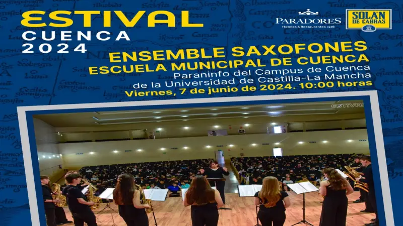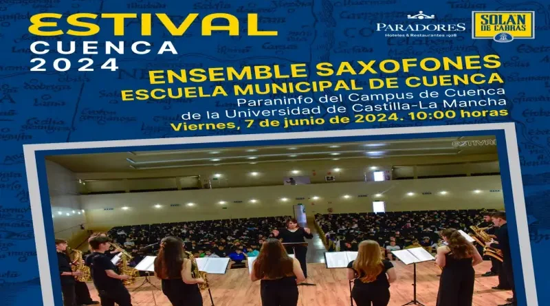 El festival internacional conquense arranca el próximo viernes 7 de junio con el concierto didáctico que el Ensemble de Saxofones de la Escuela Municipal de Música de Cuenca “Ismael Martínez Marín”, dirigido por Miriam Castellanos, ofrecerá a las 10 h. en el Paraninfo de la UCLM en Cuenca. Cerca de 700 escolares de diferentes colegios de Cuenca y provincia han llenado esta propuesta gratuita dirigida a este público.