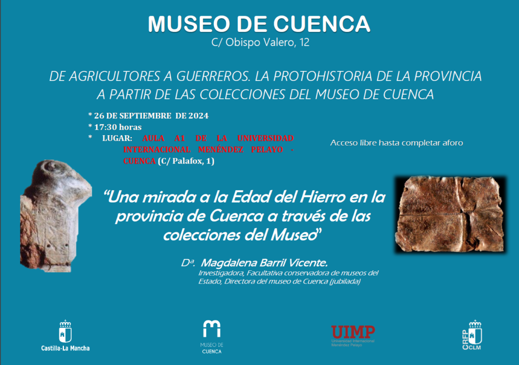 Dicha conferencia se impartirá el próximo jueves, día 26 de septiembre de 2024, a las 17:30 horas en el Aula A1 de la sede de la Universidad Internacional Menéndez Pelayo en Cuenca (C/ Palafox,1). Forma parte del ciclo DE AGRICULTORES A GUERREROS. LA PROTOHISTORIA DE LA PROVINCIA A PARTIR DE LAS COLECCIONES DEL MUSEO DE CUENCA, que se impartirá en el museo durante el segundo semestre del año.