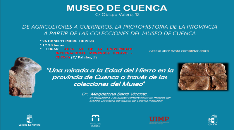Dicha conferencia se impartirá el próximo jueves, día 26 de septiembre de 2024, a las 17:30 horas en el Aula A1 de la sede de la Universidad Internacional Menéndez Pelayo en Cuenca (C/ Palafox,1). Forma parte del ciclo DE AGRICULTORES A GUERREROS. LA PROTOHISTORIA DE LA PROVINCIA A PARTIR DE LAS COLECCIONES DEL MUSEO DE CUENCA, que se impartirá en el museo durante el segundo semestre del año.