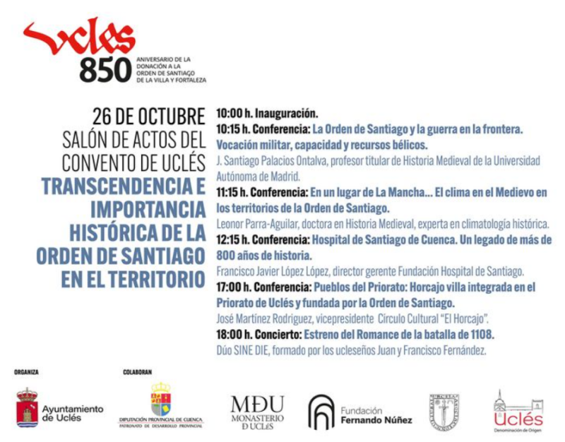 Este ciclo de conferencias ha sido organizado por el Ayuntamiento de Uclés, con la colaboración de la Fundación Fernando Núñez, el Monasterio de Uclés, la Asociación Cultural Urcela y la Denominación de Origen Uclés, dentro de la subvención de la Diputación Provincial de Cuenca para la organización de congresos.