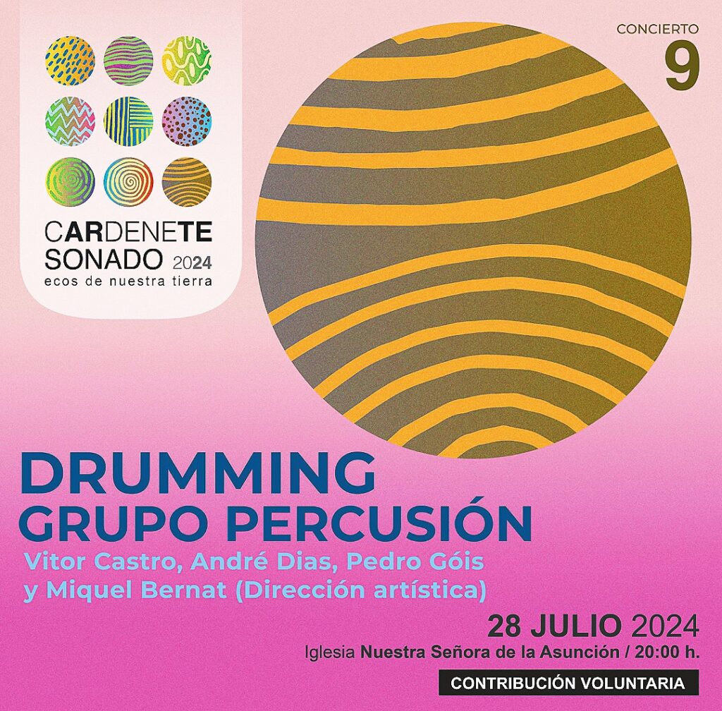 El próximo encuentro del festival será el concierto 9 cARdeneTE SONADO 2024, titulado “Ecos de Nuestra Tierra”, con la participación del grupo de percusión Drumming, formado por Vitor Castro, André Días, Pedro Gois y Miquel Bernat, quien se encargará de la dirección artística. Interpretarán obras de Philip Glass y José Manuel López López, paisano consorte de Cardenete.