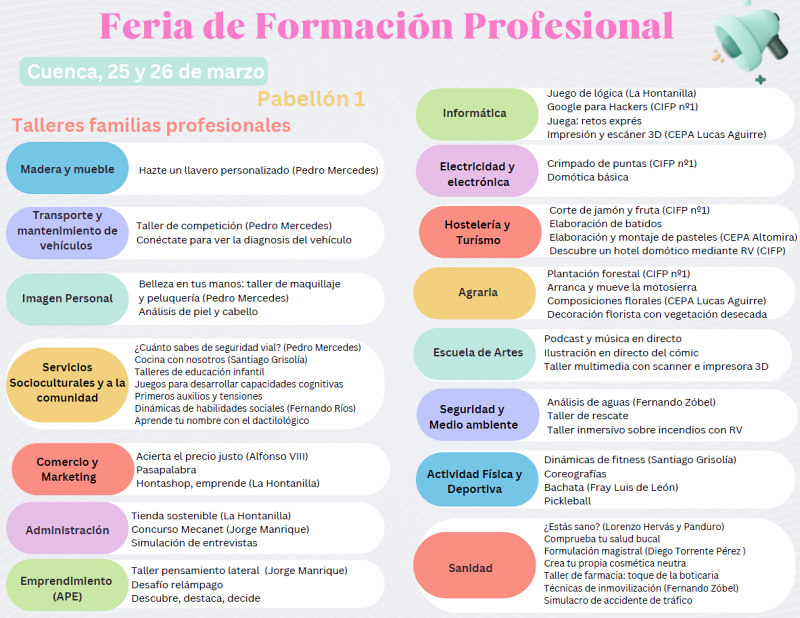 Estos talleres representan la diversidad de familias profesionales disponibles en los centros educativos de Cuenca: desde Madera y mueble, Imagen personal, Electricidad y electrónica, Hostelería y Turismo, hasta Sanidad, Informática, Seguridad y Medio Ambiente, Deporte, entre otras.