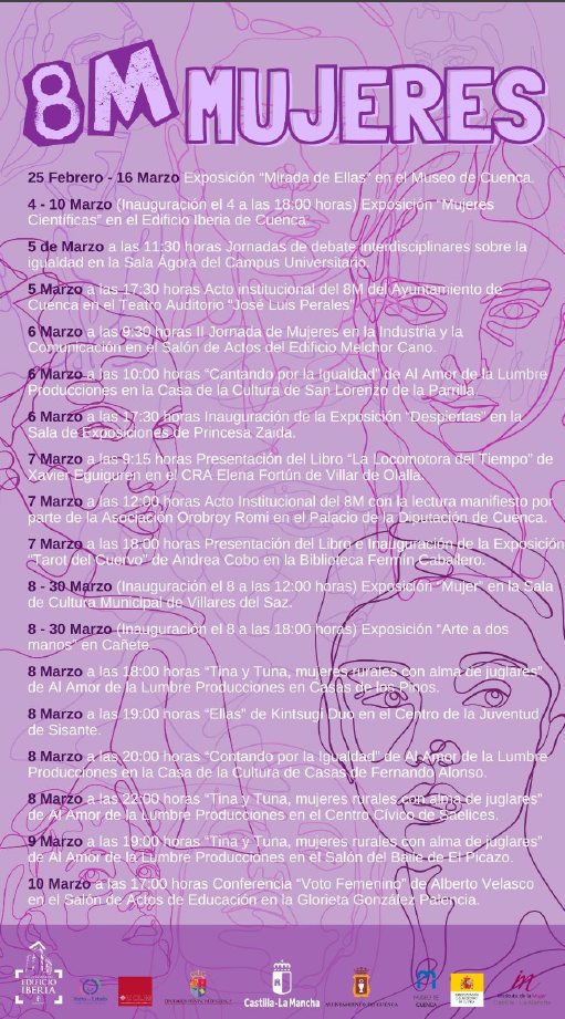 Cuenca se une a la celebración del Día Internacional de la Mujer con una completa programación de eventos que se extienden desde el 25 de febrero hasta el 10 de marzo. Exposiciones, actos institucionales, presentaciones de libros, debates y espectáculos musicales forman parte de una agenda que busca visibilizar el papel de la mujer en la sociedad y reivindicar la igualdad de género.
