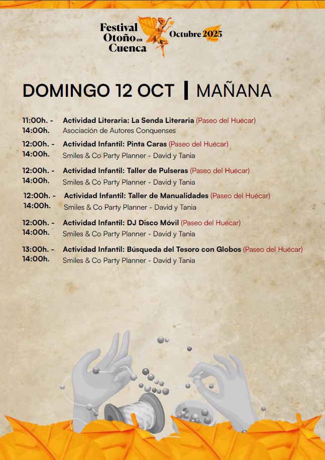 El festival continuará el domingo con una mañana dedicada a las familias. En el Paseo del Huécar, la Asociación de Autores Conquenses volverá a presentar “La Senda Literaria”, acompañada de actividades infantiles organizadas por Smiles & Co Party Planner: pinta caras, talleres de pulseras y manualidades, DJ disco móvil y una búsqueda del tesoro con globos, garantizando una jornada llena de color y diversión para los más pequeños.