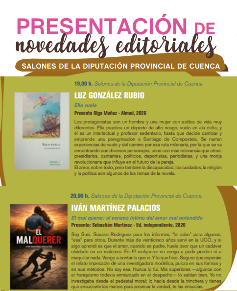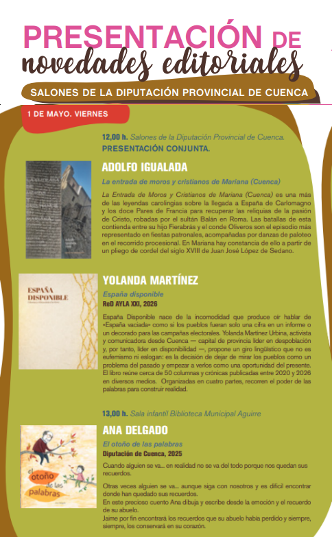 De forma paralela, a las 12:00 horas, los Salones de la Diputación Provincial de Cuenca acogerán una presentación conjunta con autores como Adolfo Igualada y Yolanda Martínez. La programación continuará a las 13:00 horas en la Sala Infantil de la Biblioteca Municipal Aguirre con la presentación de El otoño de las palabras, de Ana Delgado.