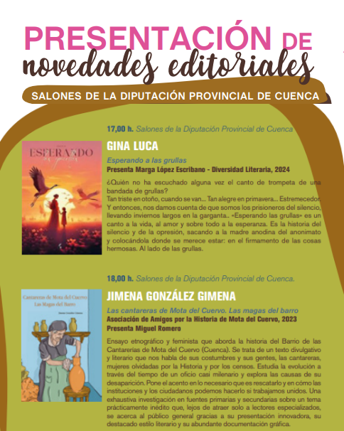 Por la tarde, a las 17:00 horas, regresará la narración oral con Cristina y Silvia en la Plaza de España, mientras que en los Salones de la Diputación Provincial comenzarán las presentaciones editoriales con Gina Luca. A las 17:30 horas tendrá lugar la firma de ejemplares de la autora conquense Paula Feel en la caseta de la feria.