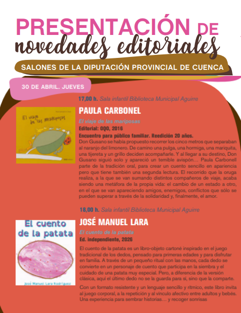 A esa misma hora, en los Salones de la Diputación Provincial de Cuenca, comenzarán las presentaciones editoriales con El viaje de las mariposas, de Paula Carbonell.