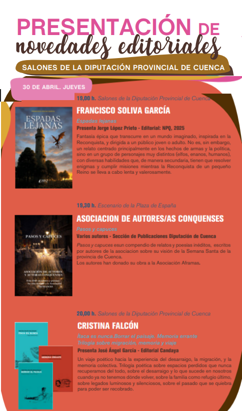 La jornada seguirá a las 19:30 horas en la Diputación con la participación de la Asociación de Autores Conquenses y su obra Pasos y capuces.