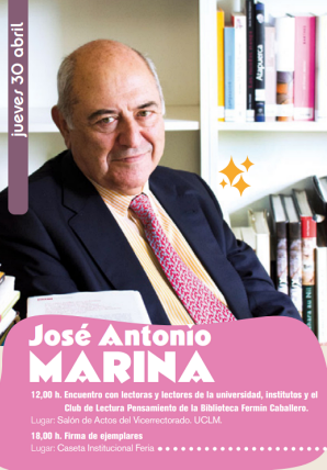 12,00 h. Encuentro con José Antonio Marina. Coordinado por Javier Espinosa, profesor de filosofía, se contará con alumnos de universidad y alumnos de institutos, así como lectores de clubes de lectura. Salón de actos del Vicerrectorado de la UCLM.
