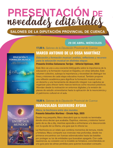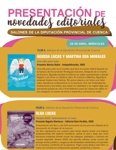 La programación se completa con varias presentaciones en los Salones de la Diputación Provincial de Cuenca, que acogerán durante la tarde actos con autores como Marco Antonio de la Ossa, Inmaculada Guerrero Ayora, Águeda Lucas y Martina Osa Morales, así como Olga Lucas.