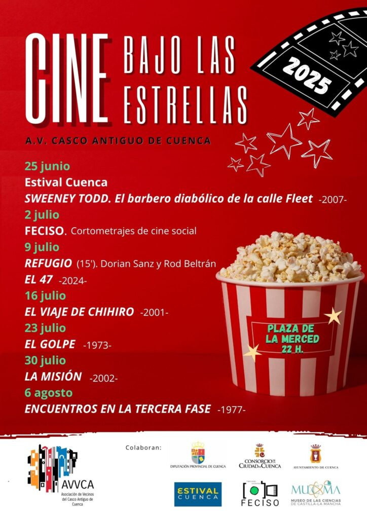 Cine bajo las Estrellas 2025, que se celebra todos los miércoles del 25 de junio al 6 de agosto, convierte cada semana la Plaza de la Merced en un cine gratuito al aire libre, ofreciendo una cuidada selección de títulos que van desde los clásicos del cine hasta propuestas sociales y actuales, gracias al impulso del Ayuntamiento de Cuenca, Estival Cuenca, FECISO, el Museo de las Ciencias de Castilla-La Mancha y otras entidades colaboradoras.
