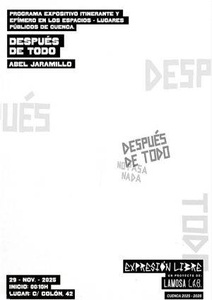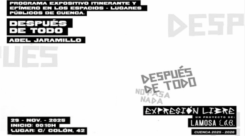 La ciudad de Cuenca vuelve a ser escenario de la creación contemporánea con ‘Después de todo’ una muestra firmada por el artista Abel Jaramillo y octava exposición del proyecto expositivo urbano ‘Expresión libre’ comisariada por Lamosa, Laboratorio Artístico Modulable. La inauguración tendrá lugar en la noche del viernes 29 de noviembre de 2025, a las 00:10 h, en Calle Colón 42, reafirmando la vocación del programa por activar el espacio público desde la poesía visual y la reflexión colectiva.
