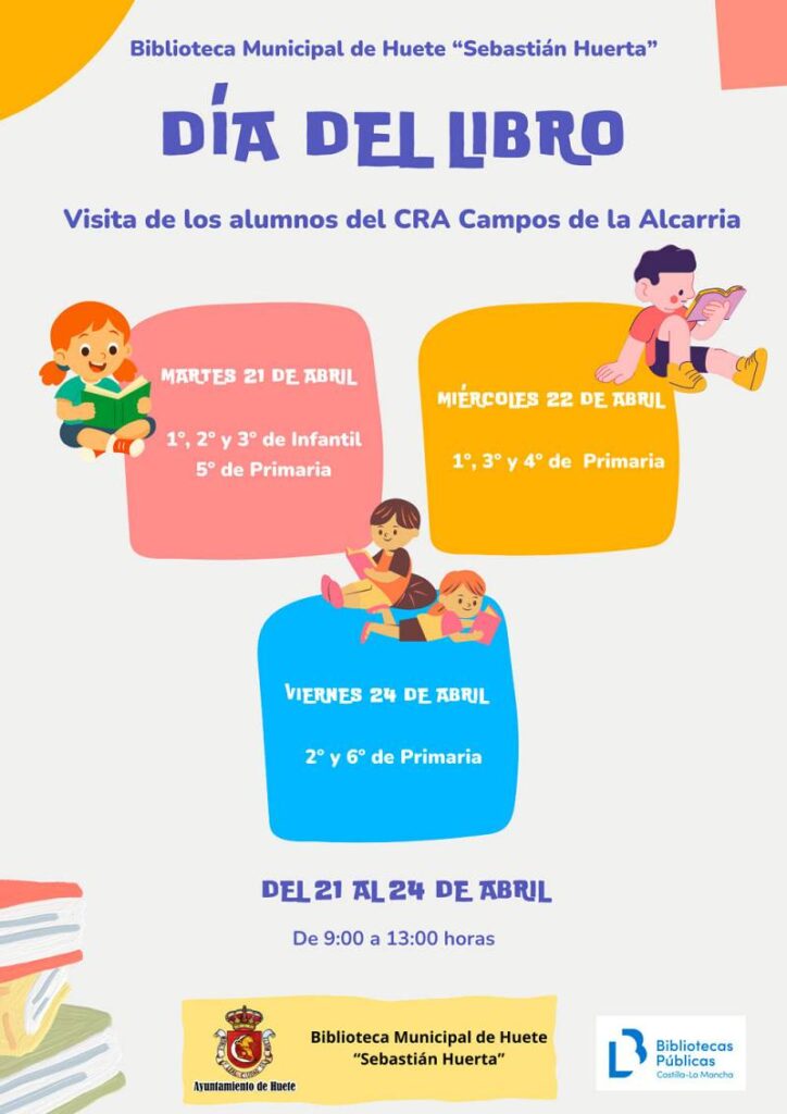 Además, la biblioteca ha organizado una serie de actividades con motivo del Día del Libro dirigidas a los alumnos del CRA Campos de la Alcarria, que se desarrollarán entre el 21 y el 24 de abril en horario de 9:00 a 13:00 horas. Estas visitas escolares permitirán a niños de Educación Infantil y Primaria acercarse al mundo de la lectura de forma lúdica y participativa.