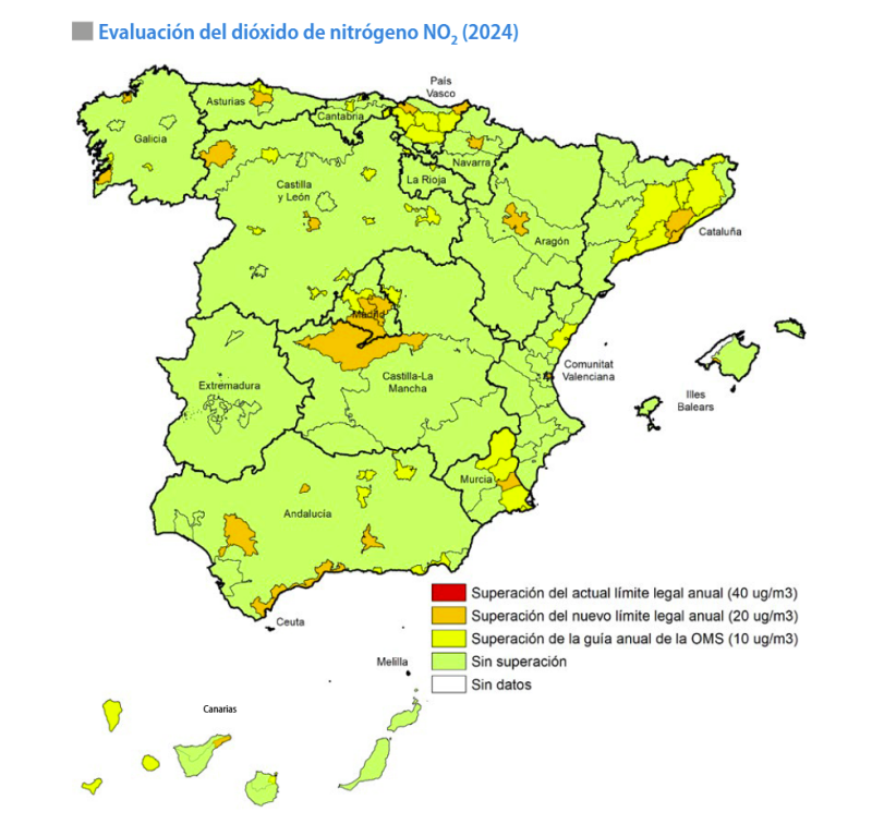 No obstante, aunque durante 2024 no se registraron superaciones del obsoleto valor límite anual vigente de este contaminante (40 μg/m3), todas las estaciones urbanas excedieron las guías diaria y/o anual de la OMS, registrando la peor situación en la estación de tráfico de Talavera de la Reina, donde la guía diaria (25 μg/m3) se superó en 94 días, rebasando también el nuevo límite anual aprobado por la Unión Europea (20 μg/m3).