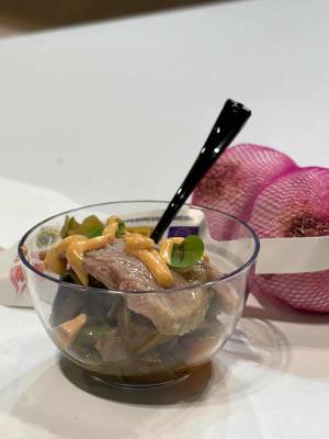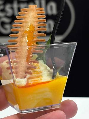 ● La segunda tapa apostó por el producto de temporada con una crema de calabaza y azafrán de Bealar, acompañada de una menestra de otoño con ajo morado IGP, setas de cultivo Neofunghi y lomo escabechado, ligada con una mahonesa de pisto, en un guiño a la cocina castellano‑manchega reinterpretada desde una óptica actual.