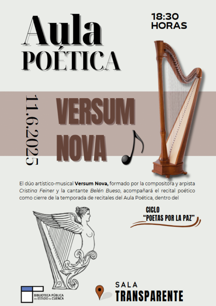 El Aula Poética clausura su ciclo en Cuenca el 11 de junio con recital y música en directo del dúo Versum Nova en la Biblioteca Pública “Fermín Caballero”.