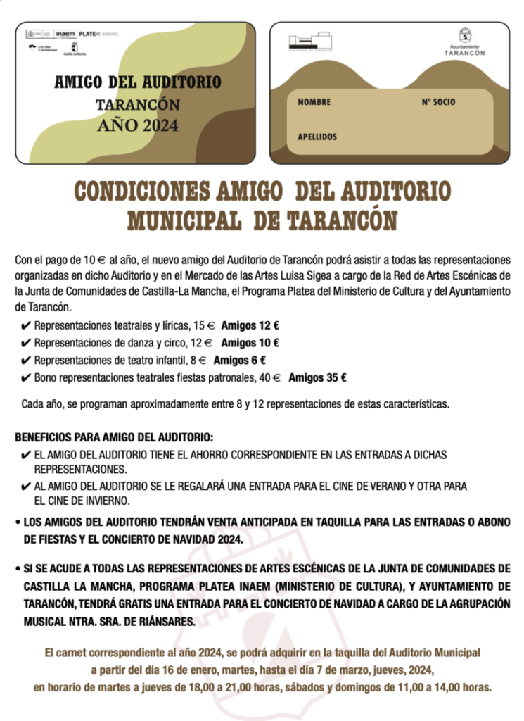 Del 16 de enero al 7 de marzo, las personas interesadas podrán adquirir el carnet correspondiente a 2024 en la propia taquilla del auditorio, en horario de martes a jueves, de 18 a 21 horas, y sábados y domingos, de 11 a 14 horas. Con el pago de 10 euros al año, los nuevos amigos del auditorio tendrán descuento al asistir a todas las representaciones organizadas en el propio auditorio y en el Mercado de las Artes Luisa Sigea, en el marco de la Red de Artes Escénicas de la Junta de Comunidades de Castilla-La Mancha, el Programa Platea del Ministerio de Cultura o del propio Consistorio. Anualmente se programan entre 8 y 12 representaciones de estas características.