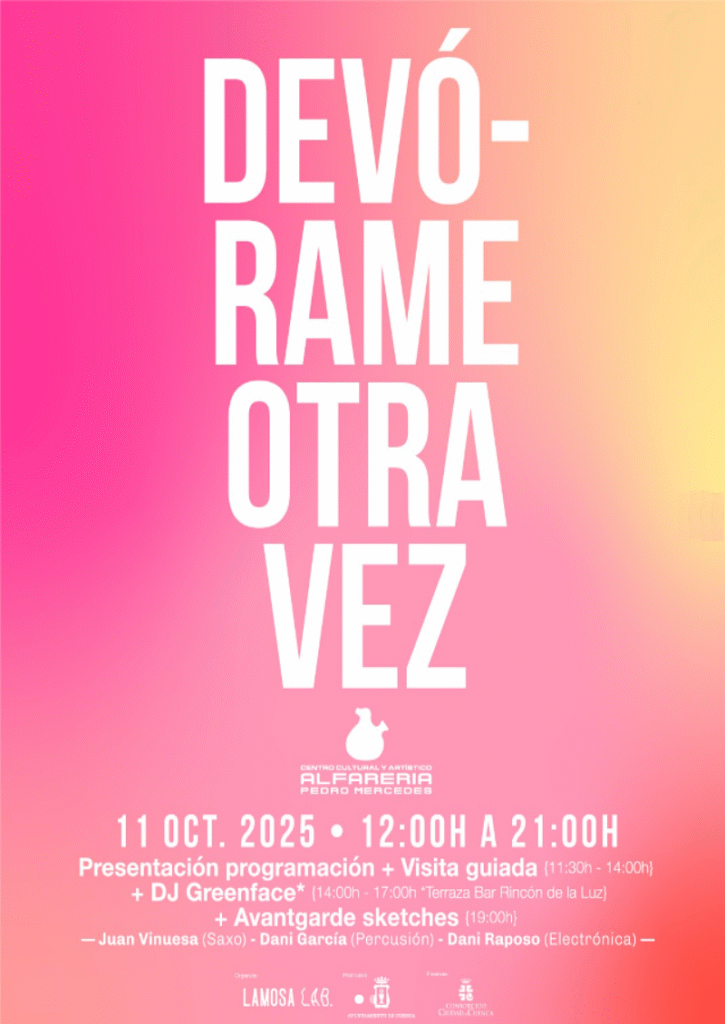 Tras casi dos años de silencio, el Centro Cultural Artístico Alfarería Pedro Mercedes vuelve a abrir sus puertas el sábado 11 de octubre con una jornada de celebración, arte y reencuentro. La iniciativa, impulsada por LaMosa_Lab y la Concejalía de Cultura del Ayuntamiento de Cuenca, cuenta con la financiación del Consorcio Ciudad de Cuenca y se presenta bajo un eslogan tan sugerente como simbólico: “Devórame otra vez”, una invitación a redescubrir la energía creativa de un espacio que forma parte esencial del patrimonio artístico y afectivo de la ciudad.