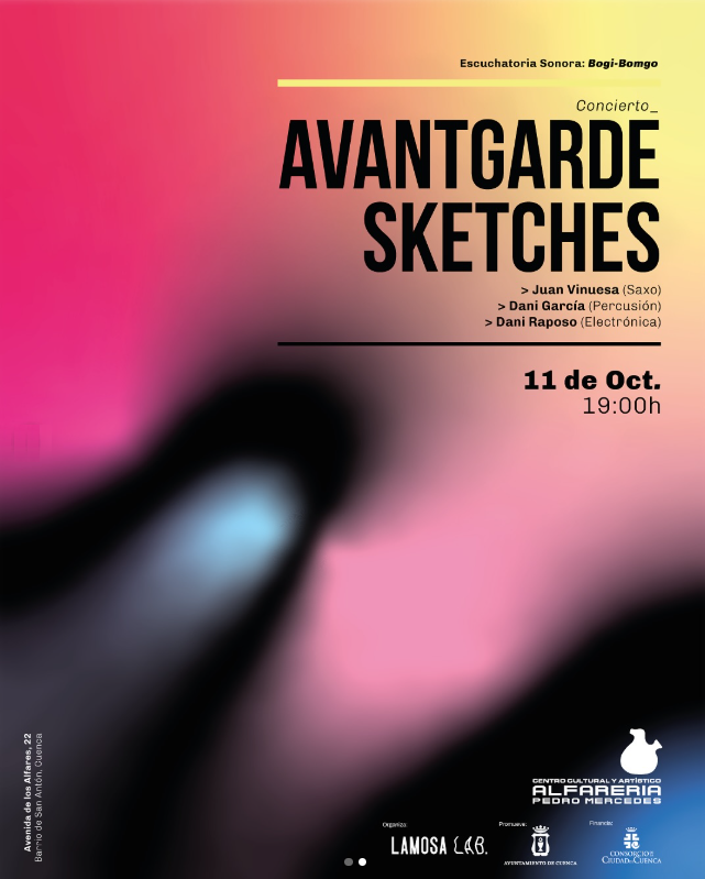 Cerraremos la jornada con el concierto titulado Avantgarde Sketches {19:00h}, un laboratorio sonoro en vivo donde los pulsos polirrítmicos de la batería de Dani García (Cuenca–Madrid) y los sonidos del saxofón de Juan Vinuesa (Albacete) dialogan sin jerarquías, creando paisajes en constante evolución. En esta ocasión, el concierto rendirá homenaje a los sonidos del barro: texturas, fricciones y percusiones cerámicas se integrarán como materia sonora —grabadas y/o interpretadas en directo— para que el alfar resuene y el público pueda escuchar la arcilla como un instrumento más. Cada track pretende ser un retrato efímero, una partitura que se reescribe en cada instante donde las fronteras entre la improvisación libre y conducida se difuminan, expandiendo el gesto musical hacia territorios imprevisibles y en deconstrucción. Daniel Raposo se sumará como invitado, ampliando el campo de juego con electrónica, interferencias y atmósferas que empujan la improvisación hacia territorios híbridos y en construcción. El proyecto se reconoce en la búsqueda, en el vértigo de lo inmediato, en la comunión de tres creadores que persiguen la elaboración de un collage sonoro que nunca se repite pero reverbera; siempre distinto, siempre cambiante.