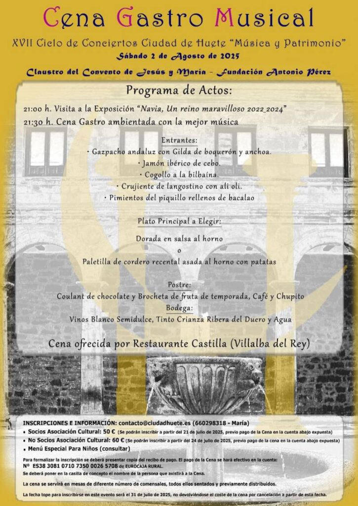 Todas las actividades son gratuitas, salvo la Cena Gastro Musical, que requiere reserva previa y tiene un coste de 50 € para socios y 60 € para no socios. Para más información y reservas: ciudaddehuete@gmail.com.