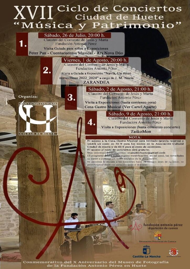 El XVII Ciclo de Conciertos Ciudad de Huete se inaugura el sábado 26 de julio a las 20:00 h con una visita guiada para niños a las exposiciones del museo, seguida del cuentacuentos musical Peter Pan, a cargo de Ars Nova Dúo. El viernes 1 de agosto, también a las 20:00 h, se ofrecerá una visita guiada a la exposición del fotógrafo José Manuel Navia, que culminará con la actuación del grupo Zarandea.
