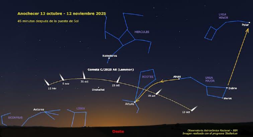 Otro protagonista del mes será el cometa C/2025 A6 (Lemmon), descubierto el 3 de enero de 2025 por el Mount Lemmon Survey (MLS). Este cometa no periódico, con una órbita estimada de 1.350 años, alcanzará su máximo brillo en torno al 1 de noviembre, con una magnitud prevista de 3.5. Podrá verse a simple vista hacia el oeste al anochecer, especialmente entre el 27 de octubre y el 8 de noviembre.