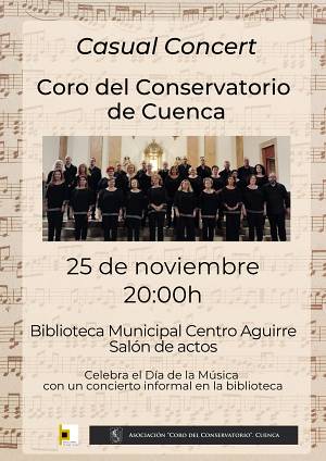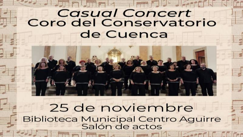 El martes 25 de noviembre, a las 20:00 horas, el Coro del Conservatorio de Cuenca ofrecerá un concierto especial en el salón de actos de la Biblioteca Municipal del Centro Aguirre. Se trata de una propuesta diferente y cercana que han titulado “Casual Concert”, concebida para acercar la música al entorno cotidiano de la biblioteca y crear un espacio donde música y literatura dialoguen en perfecta armonía.