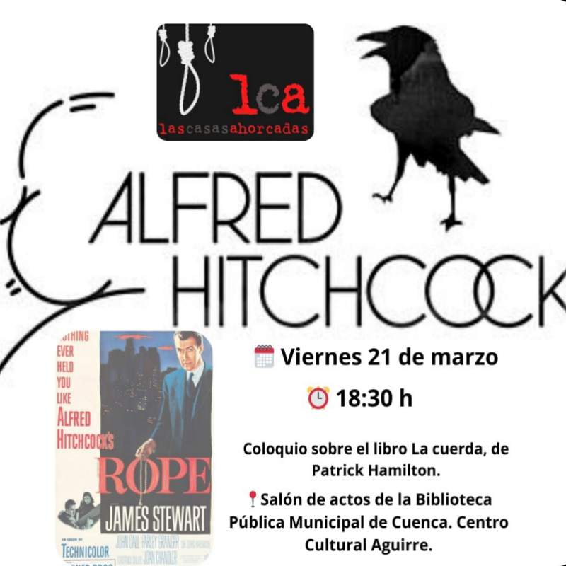 El club de lectura de Las Casas Ahorcadas continúa este viernes con su ciclo de adaptaciones de Alfred Hitchcock, que en esta ocasión comparará la película La Soga, una de las obras maestras del genio del suspense, con la obra de teatro en la que se inspira, La Cuerda de Patrick Hamilton, publicada en 1929.