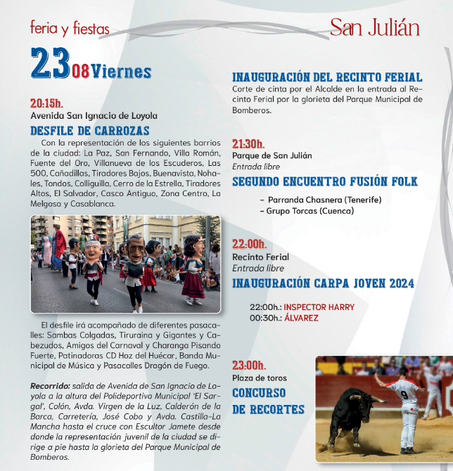 El viernes 23 de agosto se presenta como una jornada ineludible para quienes quieran disfrutar de la tradición, la música y la cultura de Cuenca en el marco de la Feria y Fiestas de San Julián 2024.