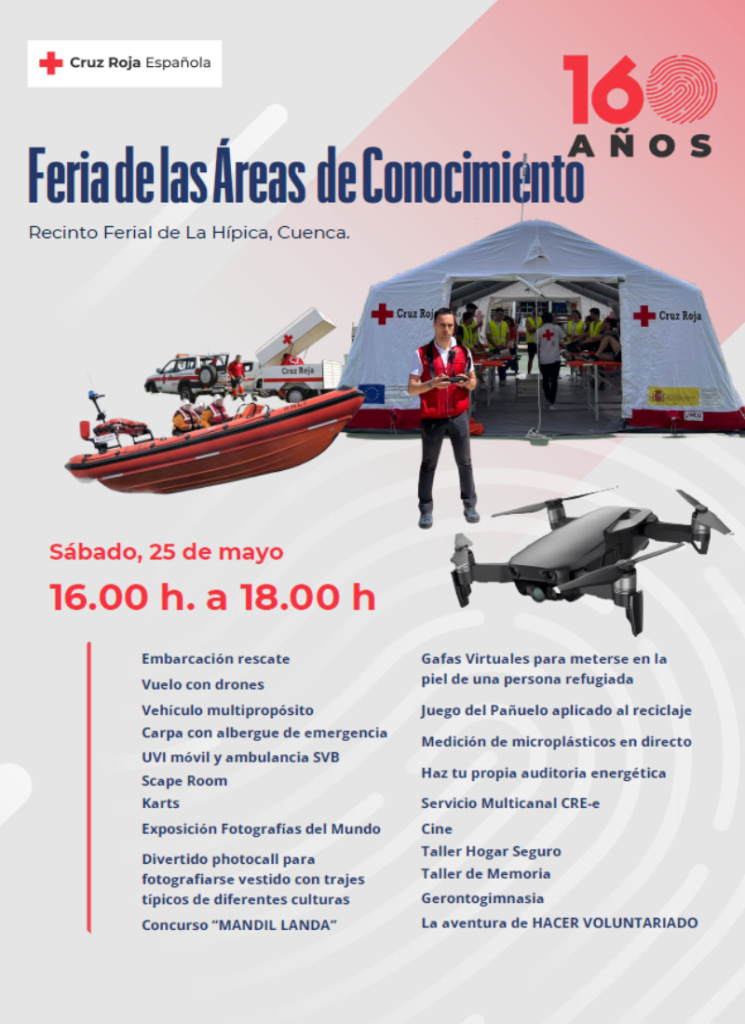 El próximo sábado, 25 de mayo, Cruz Roja celebrará el Encuentro Provincial de Voluntariado en el Recinto Ferial de la Hípica en Cuenca. Este evento clausura un mes repleto de actividades con motivo del Día Mundial de la Cruz Roja y de la Media Luna Roja, coincidiendo este año con la celebración de su 160 aniversario.
