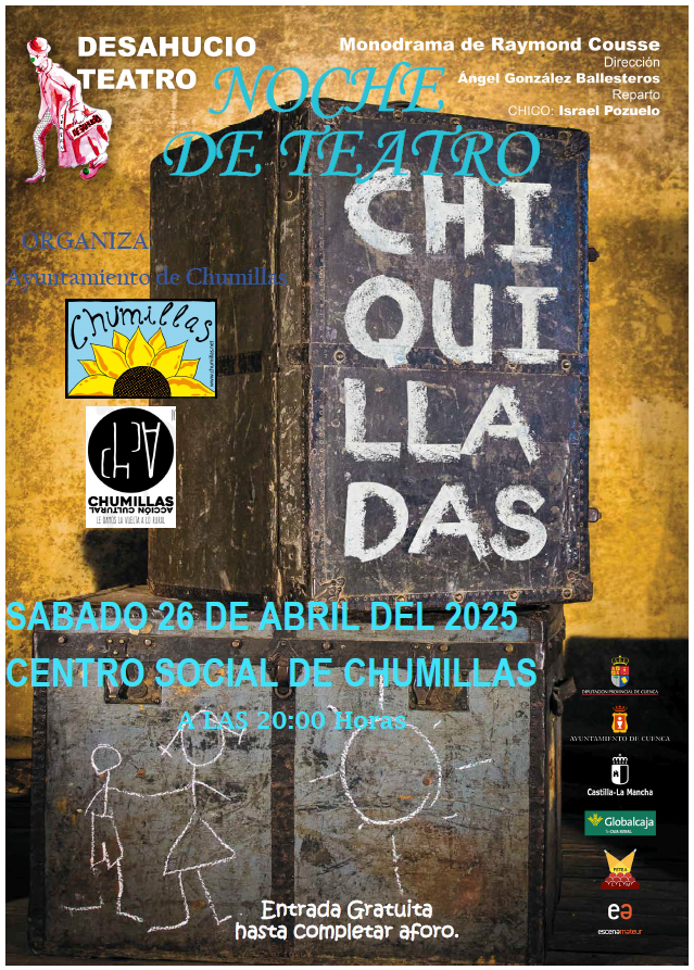 El programa ‘Cultura en Primavera’ de la localidad conquense de Chumillas continúa su programación el próximo sábado 26 de abril con la compañía Teatro Desahucio que nos presenta la obra «Chiquilladas».