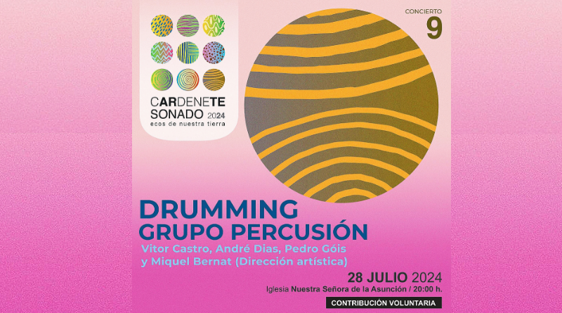 El próximo domingo 28 de julio de 2024, a las 20:00 h, la Iglesia Parroquial Nuestra Señora de la Asunción en Cardenete será el escenario del noveno concierto del festival cARdeneTE SONADO. Este evento, titulado “Ecos de Nuestra Tierra”, contará con la destacada participación del grupo de percusión Drumming.